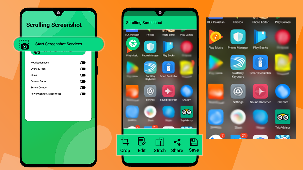 Zawiera różne inne funkcje, takie jak przycinanie/edycja/tekst/tekst na zrzucie ekranu. Zrzut ekranu — narzędzie do przechwytywania ekranu w widoku sieci Web może edytować przewijany zrzut ekranu. Aplikacja do zrzutów ekranu służy do robienia nieruchomych zrzutów ekranu oraz przewijania zrzutów ekranu. Możesz wyciąć / przyciąć wszystkie zdjęcia dotykowe zrobione za pomocą tej aplikacji. Narzędzie do przechwytywania zrzutów ekranu może łatwo robić zdjęcia jednym dotknięciem ekranu. przechwytuj zrzuty ekranu i przycinaj je do kwadratu. Capture Alert - Jest to przechowalnia przechwytywania zrzutów ekranu.