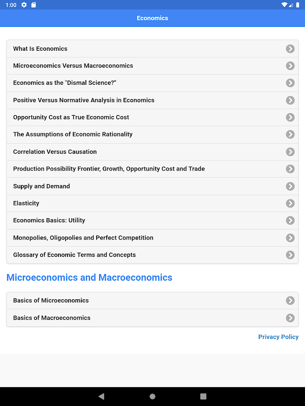 Wprowadzenie do ekonomii, makroekonomii i mikroekonomii dla studentów. Ta aplikacja zawiera notatki z wykładów, definicje i warunki ekonomii. Jeśli chcesz dowiedzieć się o ekonomii, ta aplikacja Ci pomoże. Ta aplikacja zawiera kluczowe fakty podstawowych tematów. Będzie działać jako kieszonkowe notatki.