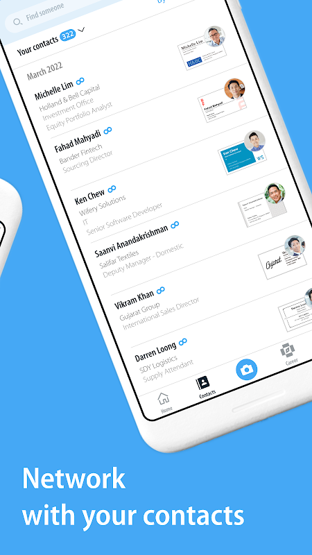 Eight to także potężna sieć profesjonalna, która umożliwia nawiązywanie kontaktów z innymi użytkownikami aplikacji i poszerzanie możliwości kariery. Zeskanowanie karty automatycznie generuje Twój profil Eight. Następnie możesz zaprezentować swoje umiejętności i poszerzyć możliwości kariery, dzielić się wiadomościami i aktualizacjami ze swoją siecią Eight, znajdować oferty pracy i szukać talentów.