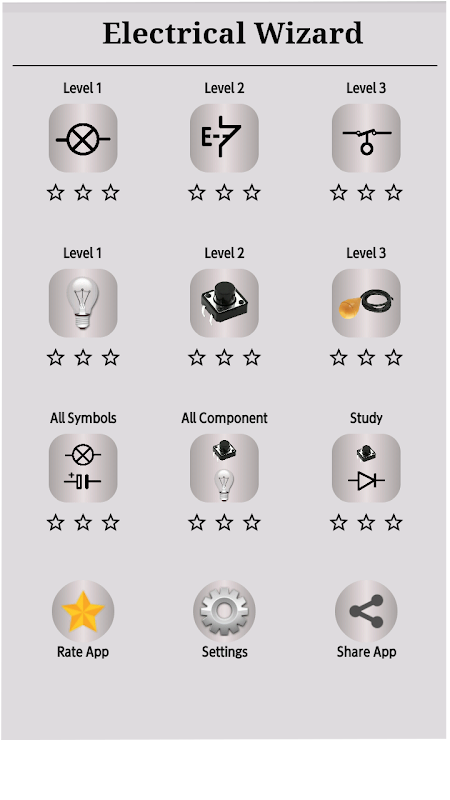 Electrical Wizard to gra quizowa, która zapewnia dobrą znajomość komponentów elektrycznych i ich symboli. Gra jest podzielona na trzy poziomy. Poziom 1 dla podstawowych komponentów i symboli, Poziom 2 dla zaawansowanych komponentów i symboli oraz Poziom 3, który zawiera profesjonalne komponenty i symbole. Istnieją trzy rodzaje gier, w które możesz grać na każdym poziomie. Gra wielokrotnego wyboru, Gra czasu lub Gra szóstkowa, która jest również bardzo interesująca. Jest również sekcja nauki, w której możesz wybrać naukę, jeśli na jakimkolwiek poziomie masz wiele trudności.