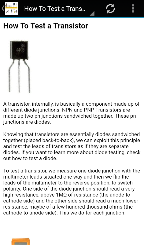 This application consists many information on how to test electronic components.Usually electronic components been test using a multimeter.In this application you will learn how to test diode,fuse,capacitor,resistor ,transistor and also relay.When you understand how to test this type of components you will gain a better understanding on electronic engineering...