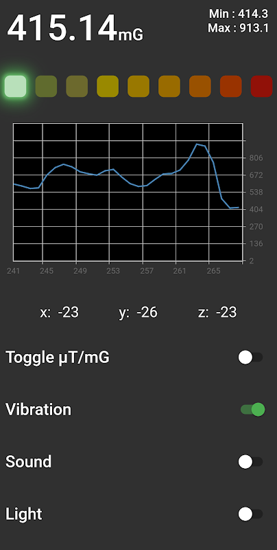 Zawarliśmy opcję światła, aby włączyć i wyłączyć latarkę urządzeń. Jest to idealne rozwiązanie dla śledztw paranormalnych, które chcą polować na duchy w ciemności. Odczyty X, Y, Z pomagają również pokazać oś, na której wykrywane są najsilniejsze odczyty.