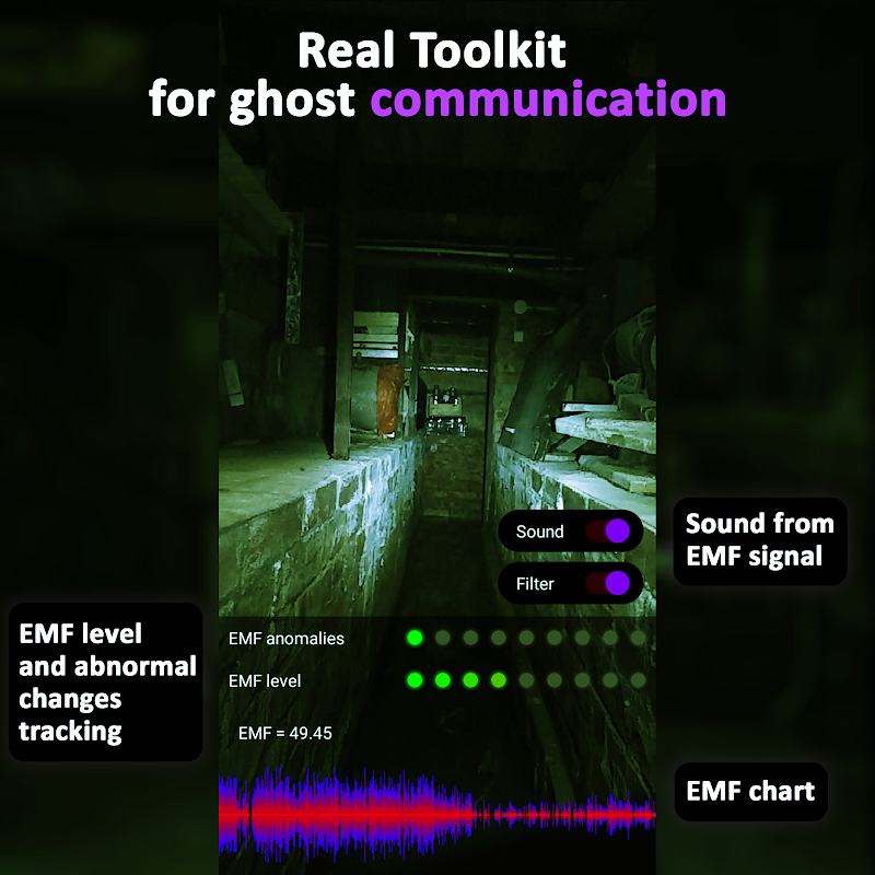 Kamera duchów z narzędziami do polowania na duchy wykorzystująca prawdziwe dane EMF do wykrywania i komunikacji. Ta aplikacja może być używana zamiast radaru duchów.