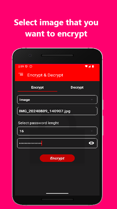● Kliknij opcję Wybierz obraz, a następnie kliknij ikonę aparatu, aby przechwycić obraz do zaszyfrowania, lub ikonę zdjęcia, aby wybrać obraz z galerii.