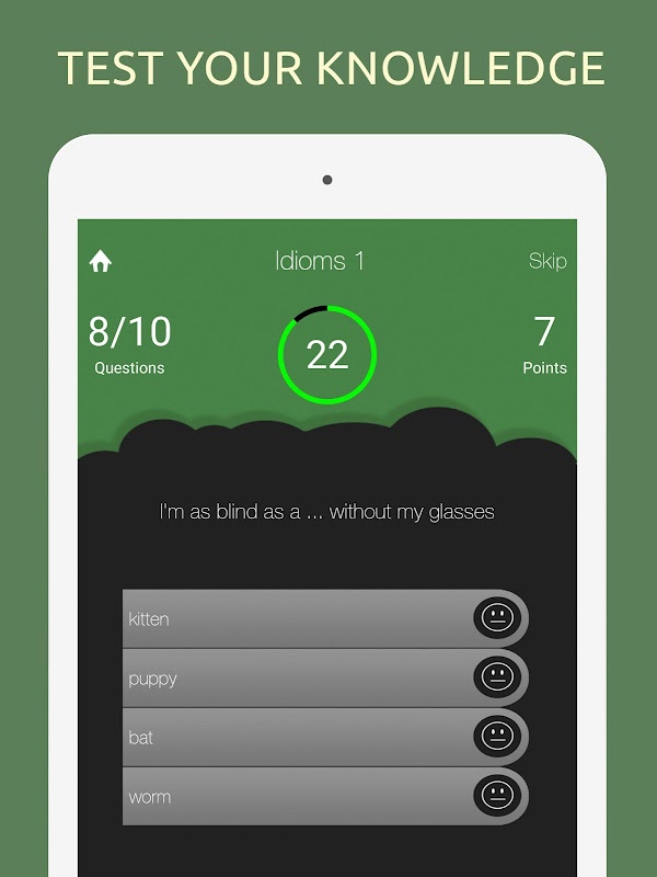 Zmierz się - sprawdzić swoją znajomość języka angielskiego idiomów, czasowników frazowych, slang, nieregularnych czasowników i przyimków. English Quiz zawiera 1750 przykładów! Poprawić swój poziom angielskiego i poszerzyć swoje słownictwo.