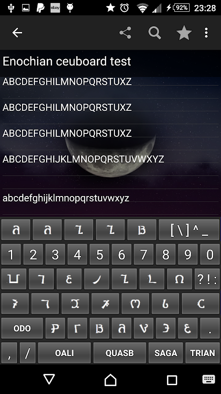 This keyboard contains of Enochian alphabet och produces english characters on screen, a fun way to learn the characters. The keyboard can be selected in settings and will coexist with the normal keyboard used.