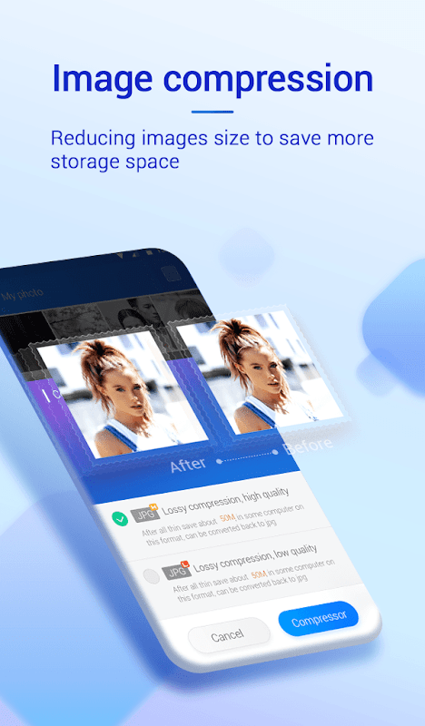 This function enables you to compress large image and seldom used image into smaller size. It will help you save more storage space. It contains two choices to compress: lossless compression and lossy compression. You could choose which compression method according to your situation.