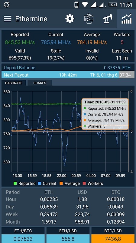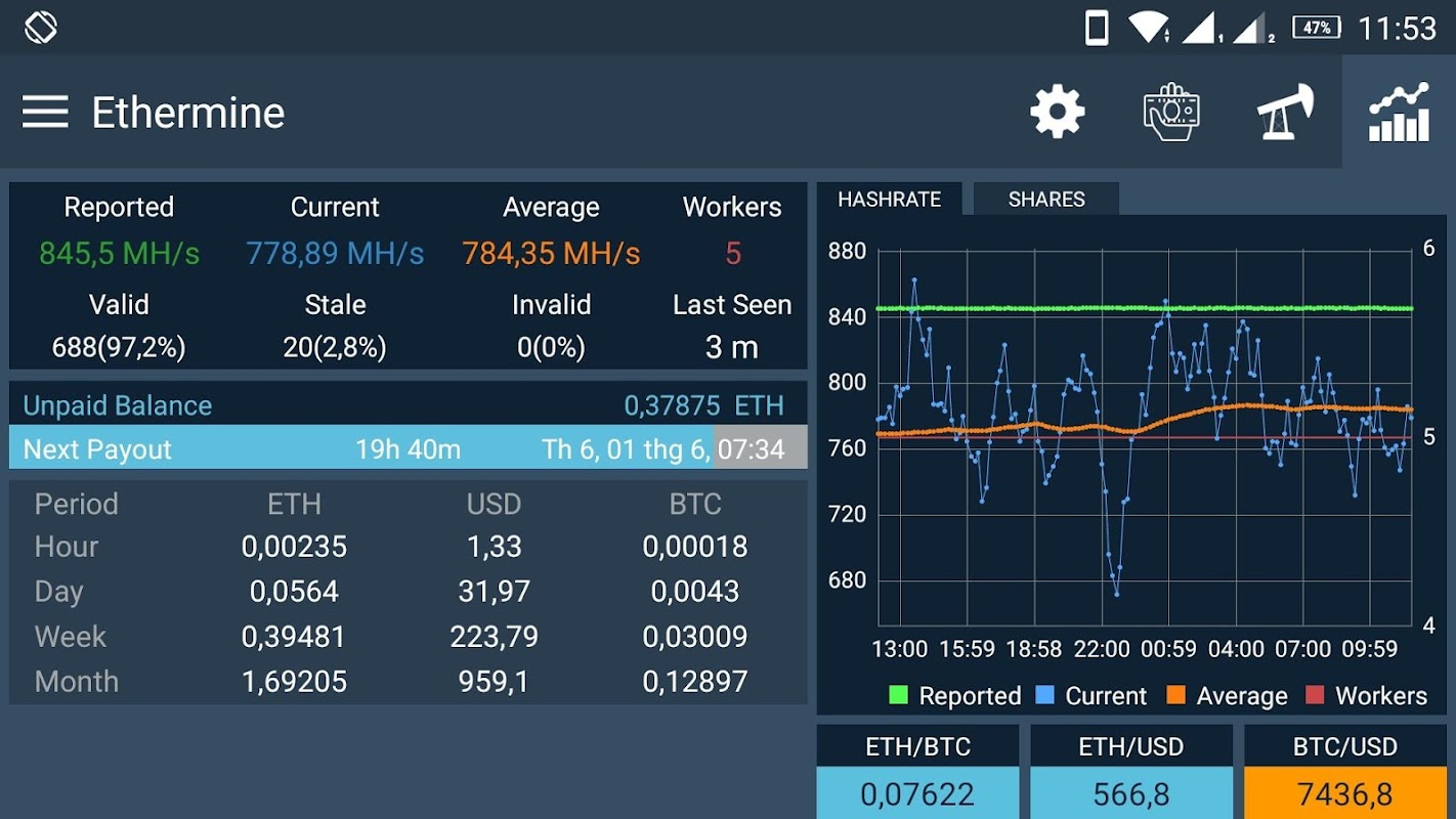 Ethermine Monitor & Notification to trzecia aplikacja do sprawdzania statusu na Ethermine (Ethermine.org). Sprawdź swój aktualny hashrate, saldo, pracowników, następne wypłaty, wykres,...