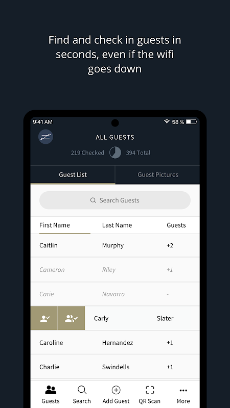 - Wszyscy Twoi goście w jednej, łatwej w zarządzaniu centralnej lokalizacji, zsynchronizowanej bezpośrednio z zaproszeniami i zameldowaniem.