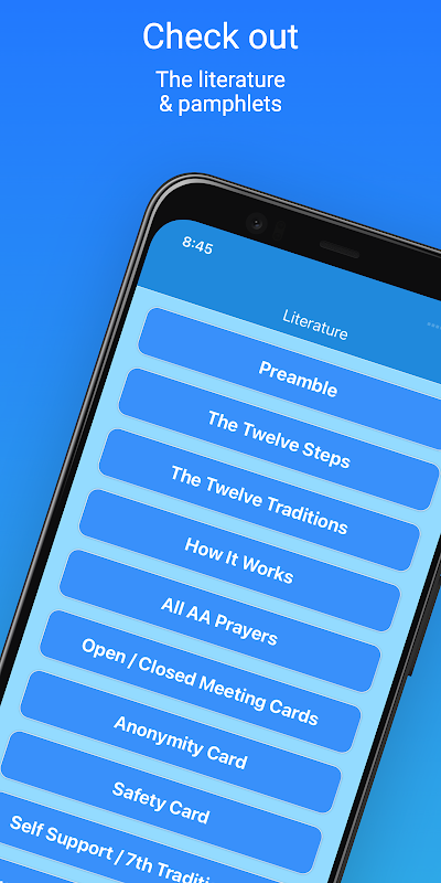 - Literatura i broszury Anonimowych Alkoholików, takie jak Jak to działa, 12 kroków, 12 tradycji, preambuła, karty spotkań AA, broszura sponsorska, modlitwy AA i wiele innych!