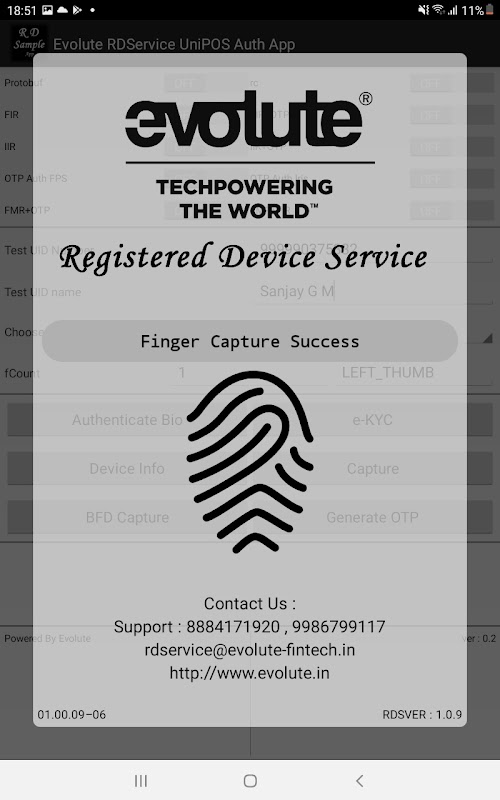 Jest to rejestrowane obsługa urządzenia (L0) urządzeń ewolutna Fingerprint skanera urządzenia Leoparda Falcon Impress lilii i IDENTI5 zapewnia ewolutna Systems Pvt Ltd Zgłoszenie to jest wymagane do korzystania z urządzenia z uwierzytelniania AADHAAR. Ta aplikacja rejestruje Fingerprint według wytycznych UIDAI do uwierzytelniania Aadhar i eKYC. Usługi RD dla naszych urządzeń umożliwiają swoje rozwiązania i użytkowników końcowych, aby potwierdzić swoje urządzenia odcisków palców z UIDAI za pomocą naszego serwera zarządzania. Do rejestracji urządzenia odcisków palców z UIDAI powinny wymagać, aby posiadać przynajmniej jedną jednostkę urządzenia ewolutna. Uruchamiając aplikację i podłączania urządzenia, usługi RD wypełnia niezbędne procesy rejestracji urządzenia z UIDAI. RD Service jest STQC certyfikowany zgodnie UIDAI zarejestrowane urządzenie Specification-v2.0.1. Urządzenia przeznaczone są do użytku w większości łatwością while umieszczenie palca. Urządzenia są odporne na duże ilości wstrząsów nawet swobodnego spadania z jak za test upadku. W przypadku jakichkolwiek błędów, będziecie mieć odpowiedni komunikat o błędzie, z którym można zbliżyć nasze help desk, jak podano poniżej w każdym dniu roboczym w godzinach pracy.