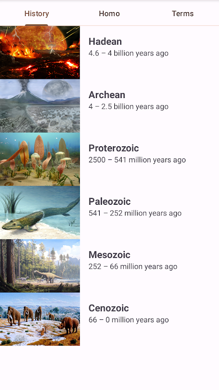 Historia ewolucji życia na Ziemi jest podzielona na cztery eony: Hadean, Archean, Proterozoic i Phanerozoic. Fanerozoik obejmuje trzy epoki: paleozoik, mezozoik i kenozoik. W ciągu 4 miliardów lat ewolucji pojawiło się wiele prostych organizmów, złożonych roślin i zwierząt.