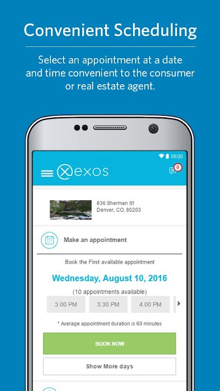 Z Exos Scheduling, konsumenci i agenci nieruchomości są w stanie umówić szacunkowego w terminie i czasie, który wygodnie pasuje do ich harmonogram, wszystkie ze swojego urządzenia mobilnego.