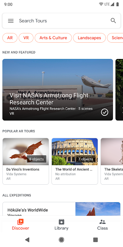• Wybieraj z rosnącej liczby ponad 800 ekspedycji. Każda zawiera wyselekcjonowany zestaw obrazów VR lub obiektów AR razem ze zintegrowanymi opisami, tematami do dyskusji i pytaniami.