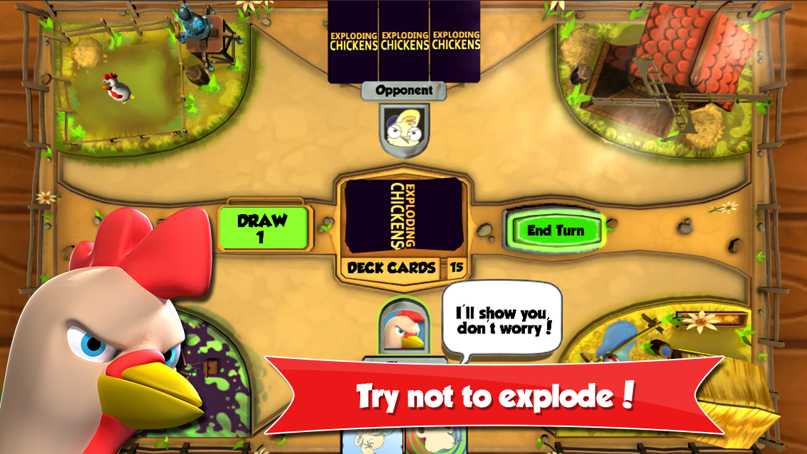 The deck is made up of different cards that let you avoid exploding by checking the next 3 cards in the deck, forcing your opponent to draw multiple cards, shuffling the deck, stealing a card from your opponent, duplicate one of your current cards and more. The game gets more and more intense with each card you draw from the deck because fewer cards left in the deck means a greater chance of drawing the exploding chicken cards.