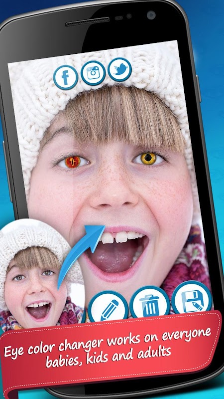 Zaskocz swoich znajomych z umiejętności manipulacji obrazu. Niech wyobraźni ożywają i zrobić zdjęcia wysokiej jakości HD z tym Photo Editor. Ćwicz swoje umiejętności do edycji obrazu i zadziwia wszystkich swoją kreatywnością! Prosta konstrukcja tego inteligentnych aplikacji telefonu pozwoli Ci dokonać tapety telefonów HD w sekundę! Mają studio fotograficzne w dłoni! To nie ma znaczenia, jeśli nie mają jasną barwę oczu, to edytor zdjęć będzie pracować dla każdego koloru oczu. Dzięki naszej unikalnej techniki mieszania będziesz wyglądać jakbyś miała operację oczu zmiana kolorów! Dodaj różne niestandardowe naklejki i trzeba będzie różne kolorowe oczy. Złóż niesamowitą galerię zdjęć z naszych realistycznych efektów fotograficznych! Popraw swoje Autoportrety z tym free aplikacji montażowym!