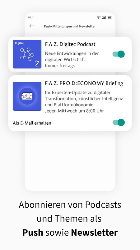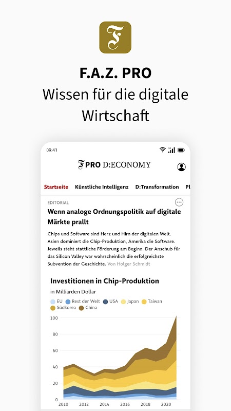 F.A.Z. PRO D:ECONOMY to aktualizacja ekspercka, która pomaga zrozumieć istotne zmiany w gospodarce cyfrowej. Głównymi tematami są transformacja cyfrowa, sztuczna inteligencja i ekonomia platform. Artykuły są pisane przez doświadczonych redaktorów i specjalistów branżowych ze wszystkich ważnych dziedzin cyfrowych.