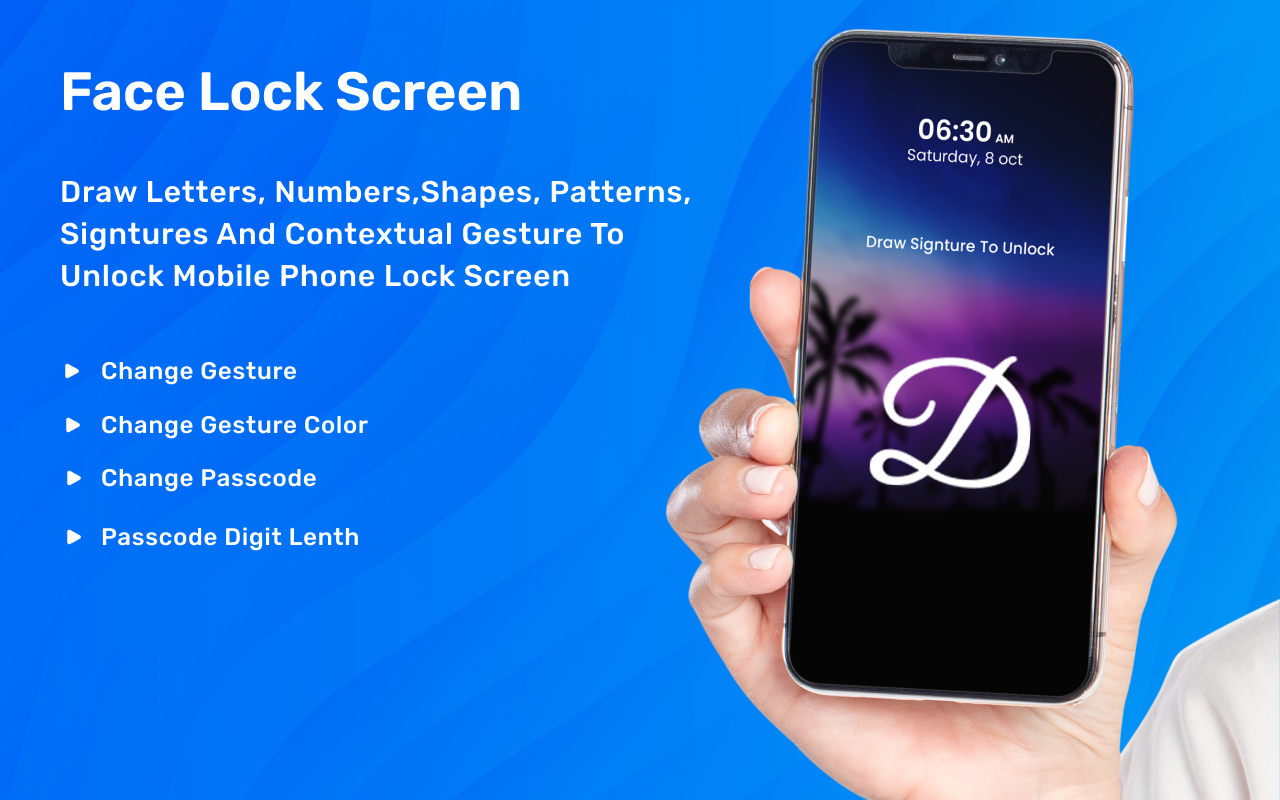 Signature Lock Screen application has feature of creating new Signature, change color of Signature, change background theme of Signature