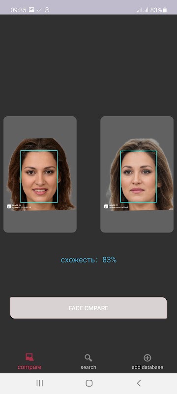 Это простое приложение которое способно сравнивать два лица на схожесть, вам просто нужно открыть в приложении две фотографии на которых изображены люди и нажать на кнопку, после чего приложение даст ответ на сколько похожи два лица. Сразу хочу пояснить что приложение не ищет аккаунты в соц сетях, оно сравнивает два лица на схожесть, еще раз хочу сделать акцент именно на двух лицах ... это значит что если вы загрузите фото на котором несколько лиц, то приложение сравнит все равно только два лица. риложение умеет работать автономно, то есть ему не нужно подключение к сети интернет. Nie ma wątpliwości, że można się na to zgodzić w wielu filmach i zrobić to na zdjęciach, które są dostępne! Так же есть возможность создать свою базу данных из фото и выполнять поиск по этой базе, то есть приложение сравнит одно лицо на фото которое вы загрузите и найдет похожих людей из вашей базы данных