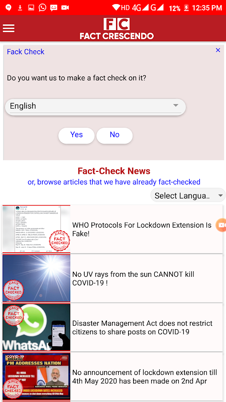 The app name is Fact Check which is using to display all the verified Fact news to users with different languages and also user can check whether the new is fake or not with the help of text, visual and video search, user just need to enter and upload a image/ video to know the news in fake or not. which include ML gives the replay with the help of google AI api's whether the news is fake or not , if news didn't exist in google data base human interaction will be there to do do fact check/research on the particular request and send response to them, App contains strong server and data base which can give response soon and store n number of news getting from clients, Here we are providing 10 different language which user can select any particular language to know the information about the already verified news or user can select the language when user is submitting the request, So user will get the response in the same language. request and response which was happening by the email id when ever the user want a particular news to be fact check, user can send the request by submit button the application will pop to enter mail id and asking for desired language , so while getting the response based on this steps user will get the response in particular language whether news is fact check or not .
