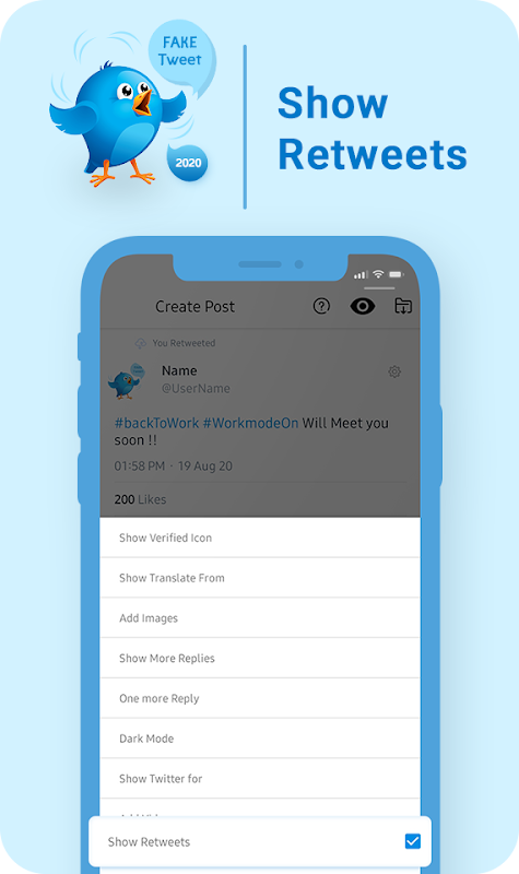 Ten piękny "fałszywy edytor postów - fałszywy edytor postów dla twita" pozwala zwiększyć liczbę komentarzy i polubień. Możesz edytować / tworzyć zrzuty ekranu z fałszywymi tweatami i udostępniać je znajomym. Próbuj swoim znajomym, spełnij swoje marzenie o twitea i twórz śmieszne memy, czyniąc dzisiejszy Twitea swoją pierwszą fałszywą Tweat!