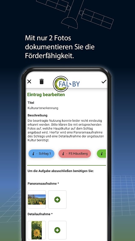 Jeśli nie uda się osiągnąć jednoznacznego wyniku przez monitoring satelitarny, jako zarejestrowany użytkownik otrzymasz zadanie w FAL-BY. Widok mapy ułatwia orientację. Następnie możesz zrobić jedno lub więcej zdjęć określonego obszaru. Te zdjęcia pomogą odpowiedzialnemu urzędnikowi w AELF ocenić sytuację. W większości przypadków rozbieżności można szybko wyjaśnić na podstawie przesłanych zdjęć. W wielu przypadkach kontrola na miejscu nie jest już konieczna i oszczędza czas.