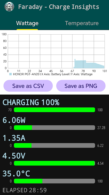 Aplikacja mobilna zaprojektowana do pomiaru w czasie rzeczywistym wskaźników ładowania, takich jak moc, napięcie, natężenie i temperatura. Dodatkowo może generować wykresy historyczne przedstawiające trendy mocy i temperatury w czasie. Aplikacja rejestruje moc ładowania i temperaturę na różnych poziomach naładowania akumulatora, a następnie zestawia te dane w postaci wykresów słupkowych w celu łatwej wizualizacji.