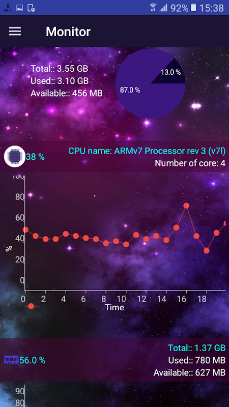 👉 Displays the CPU, RAM, network speed, and memory space of your Android device as a graph.