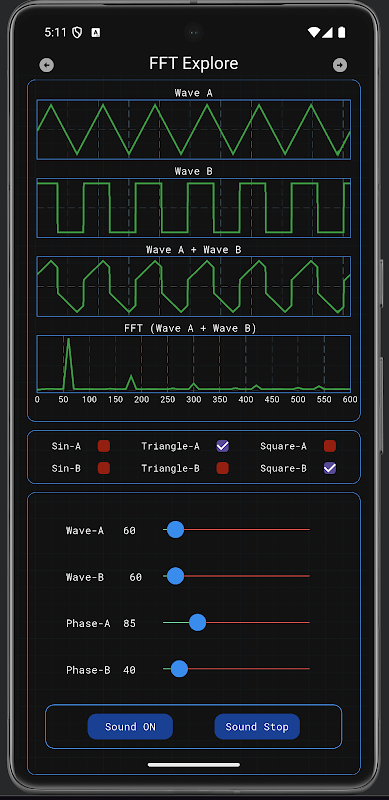 Ta aplikacja wygeneruje fale podwójne sin/trójkąt/kwadrat i kompozytowe FFT