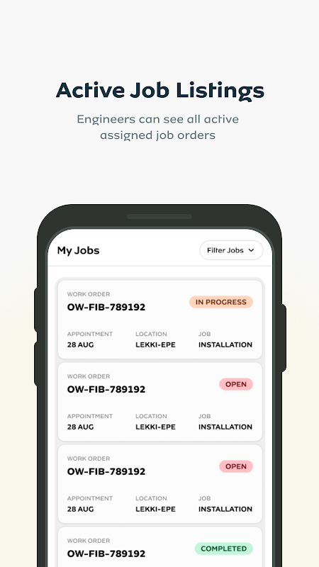 Natychmiastowe przydzielanie zadań: Otrzymuj nowe zadania instalacyjne bezpośrednio na swoje urządzenie ze wszystkimi wymaganymi danymi klienta i lokalizacji.