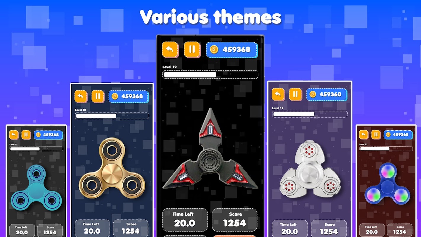 Mobilny spinner to jeden ręczny spinner, który możesz obracać na swoim urządzeniu. Ostrza fidget spinner obracają się wokół łożyska. Fidget Spinner Simulator zawiera wiele układów fidget spinner, takich jak projekty dwu- lub trójzębne z łożyskiem w centralnej okrągłej podkładce. Po prostu zakręć spinnerem i ukończ poziom Fidgets Spinner 2023 i odblokuj różne fidgets spinnery.