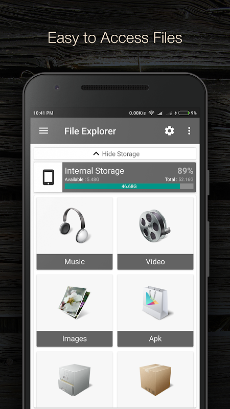 You can find any kind of file using our fast search technique. We made this application for multiple use like play music, watch video, manage files, make favorite files in favorite category, category wise files easy file selection mode to cut, copy and paste files, rename files, music library and much more facilities we provided in this file manager.