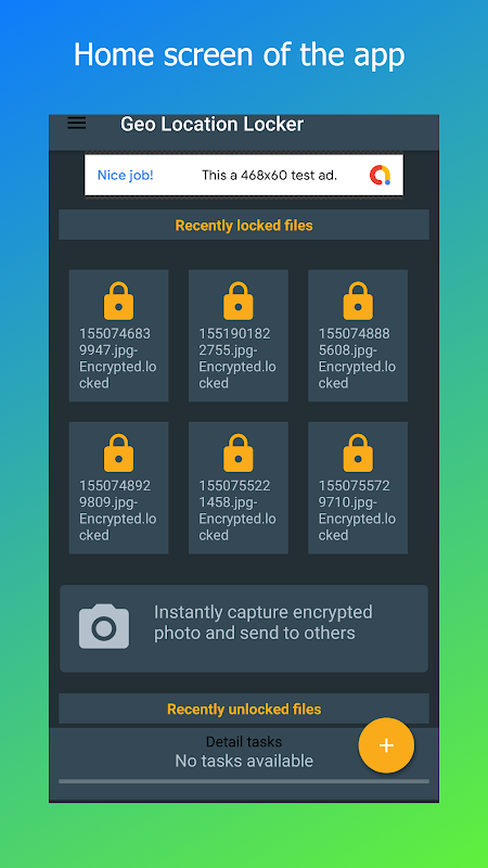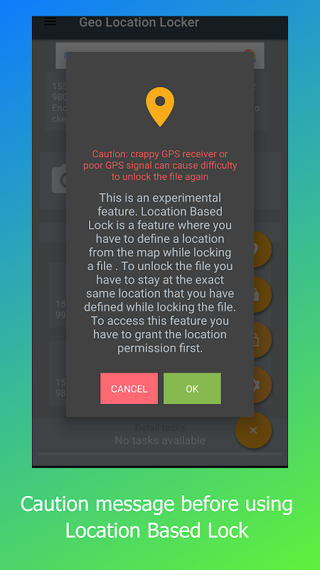 With normal file encryption this app introduces geo location file encryption that locks your files with your picked location . Which means your files will be only decrypted if you stay at the location you picked while encryption.