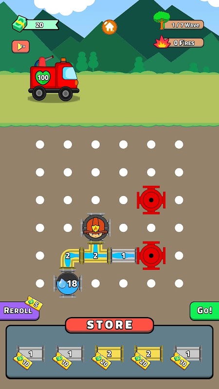 Zbuduj najlepszy system przeciwpożarowy w tej logicznej grze RPG! Połącz rury na siatce 6x6, aby zwiększyć ciśnienie wody w wozie strażackim i ugasić szalejące pożary, zanim będzie za późno!