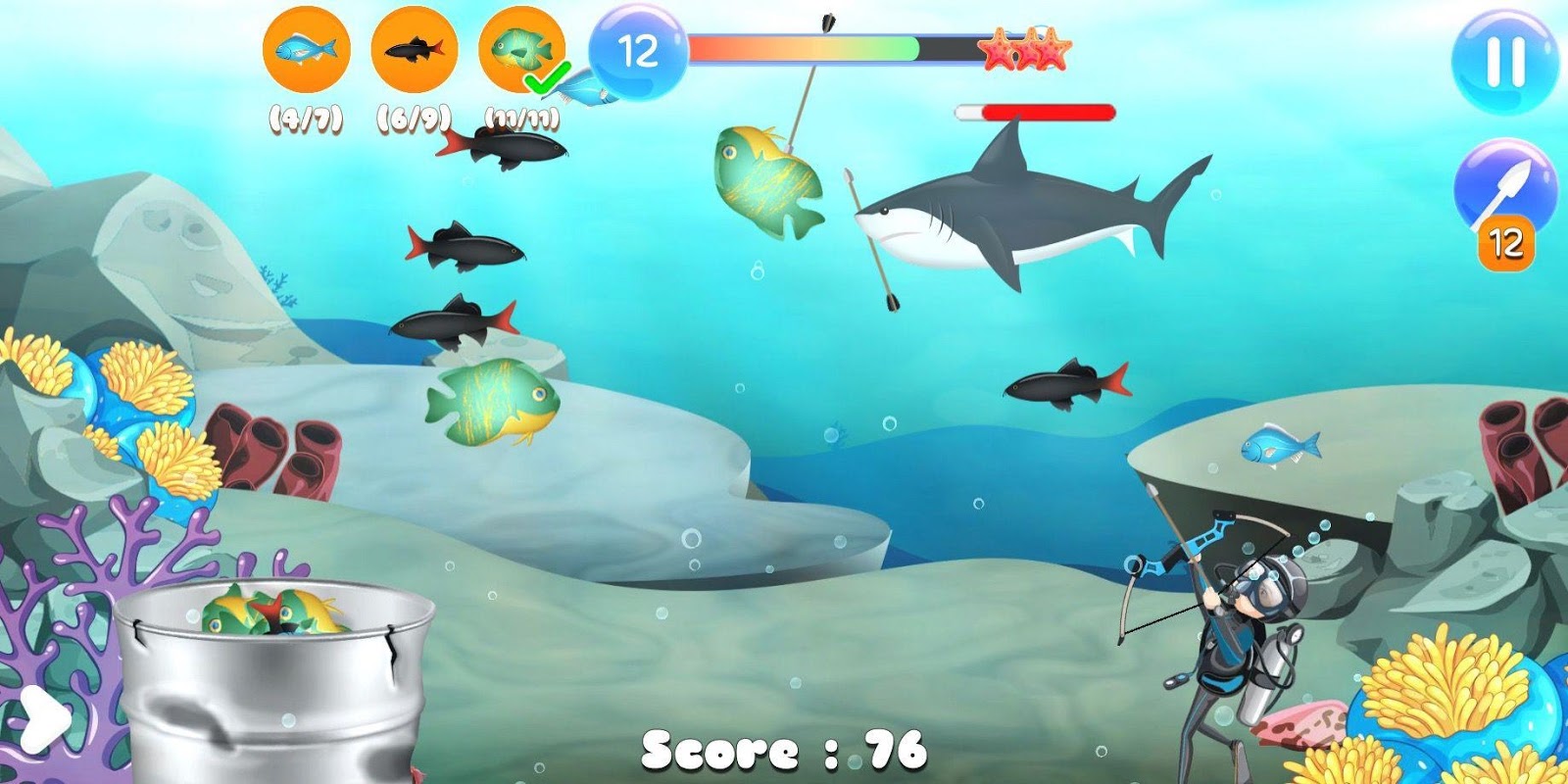 Fish Hunting to niesamowita gra wędkarska z prostym interfejsem użytkownika. To prosta, ale interesująca gra, w której użytkownik otrzymuje łuk i strzały, musisz polować na ryby, aby zdobyć punkty, otrzymujesz różne wyzwania, a także otrzymujesz dodatkowe postacie, takie jak rekin itp., które dodadzą więcej zabawy do gry i możesz zmieniać moc, łącznie 6 mocy, które możesz zdobywać poziom po poziomie, aby trafić więcej ryb, rzucaj sobie wyzwanie, aby zdobyć więcej punktów. Zabij swój wolny czas zabawą.