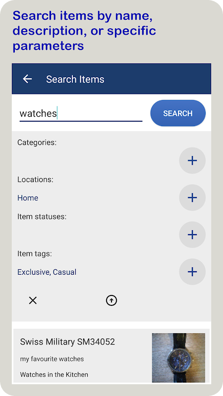 Możesz przeszukiwać swoje przedmioty według nazwy lub opisu, a także określać kategorie, lokalizacje, status lub tagi.