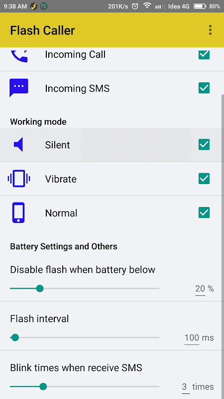 4) Set the flash on Call and SMS working in any mode ( Normal, Vibrate or Silent )