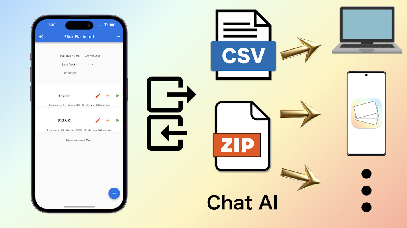 Flick Flashcard może importować i eksportować dane z fiszek w popularnych formatach plików. (.csv / .zip)