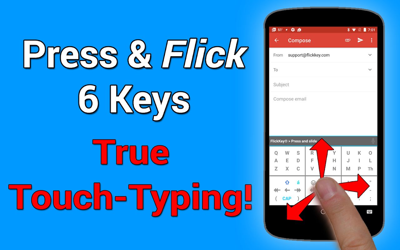 Unikalne naciśnij sześć-key i zjeżdżalnia app "Flick" klawiatury dla Androida. Prawdziwa pisania bezwzrokowego - miej oczy na tekst!