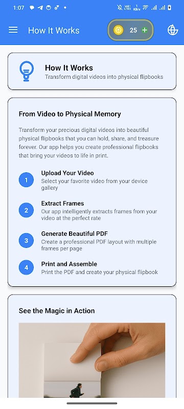 Flipbook Maker to potężna aplikacja na Androida, która przekształca Twoje cyfrowe filmy w piękne, gotowe do wydruku flipbooki. Przeżyj magię tradycyjnych flipbooków, zamieniając swoje ulubione wspomnienia wideo w fizyczne pamiątki, które możesz trzymać, udostępniać i pielęgnować na zawsze.