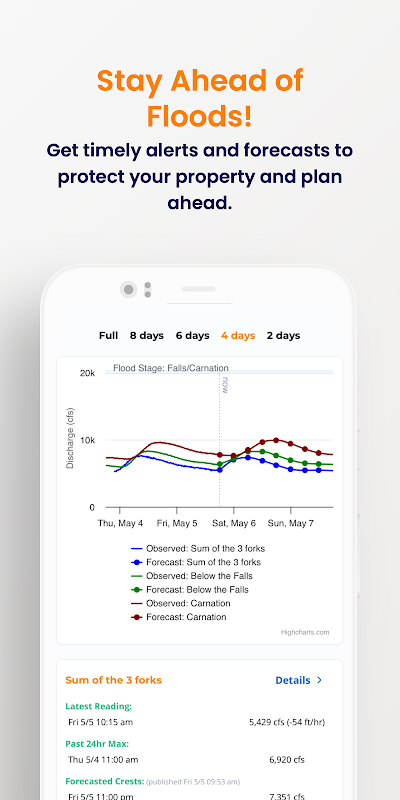 Floodzilla zapewnia informacje o powodziach w dolinie Snoqualmie w czasie rzeczywistym, w tym: