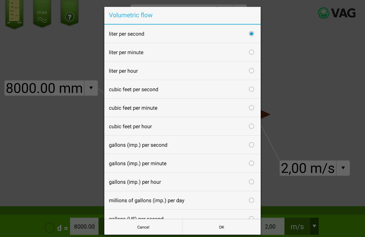 FlowCalculator umożliwia szybkie i łatwe obliczenie przepływu objętościowego w zależności od średnicy rury lub prędkości przepływu. Zmień wartości w trójwymiarowej reprezentacji graficznej, dotykając ekranu jednym lub dwoma palcami lub dotykając odpowiedniej wartości, aby zmienić ją również numerycznie.