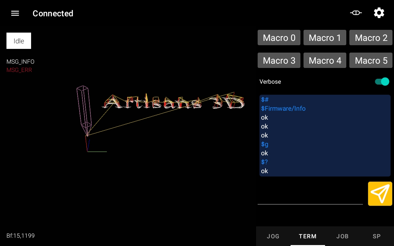 Obsługuje 4 osie, jog, terminal, wysyłanie kodu G, sterowanie wrzecionem. Do łączenia się z maszyną używa protokołu Telnet przez Wi-Fi.