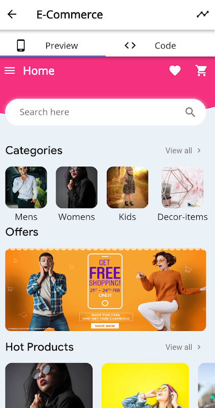 Przewodnik po kodzie Flutter przedstawia różne komponenty, widżety i ekrany Flutter w wersji demonstracyjnej z widokiem kodu źródłowego side-by-side.