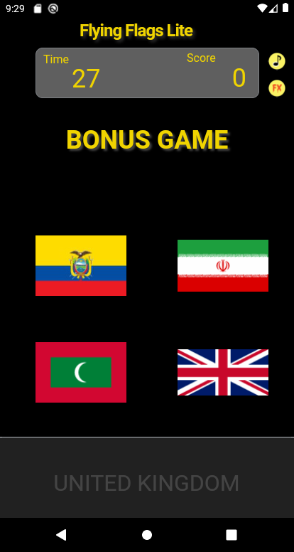This game is easy to play, but there is a carefully designed learning process at its core. Through repetition, disambiguation and staged progression, you will recognize, and retain in your memory, the national flags of 50 countries. Tap on the flag that matches the country name while it is visible at the bottom of the screen. Avoid UFOs, as they take away points! So does getting a flag wrong!