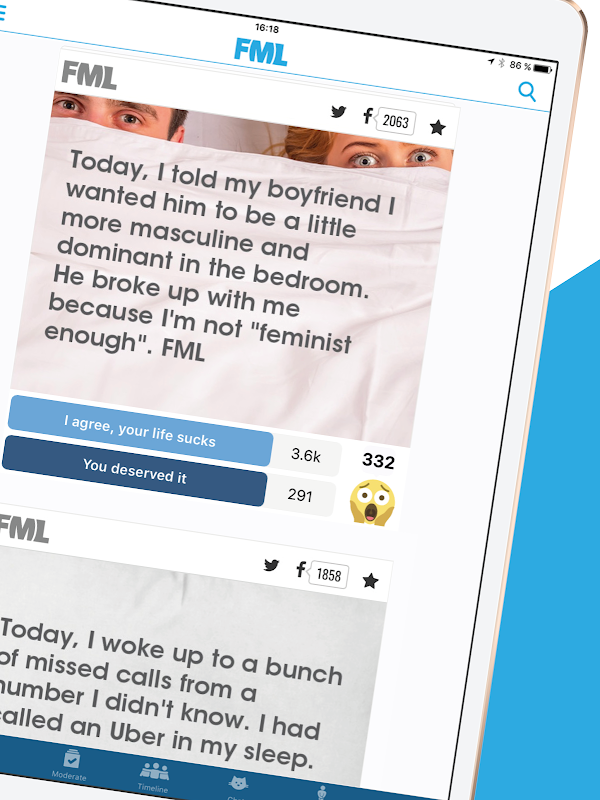 Download FML to join our millions of subscribers, meet people (in a friendly way, of course, sort of!), submit FMLs, find out the latest offbeat news with FML News, take part in debates in the comments, check out the funniest photos our team and our users have found, send each other messages via the private messaging system, check out the illustrated FMLs, giggle at our video content…
