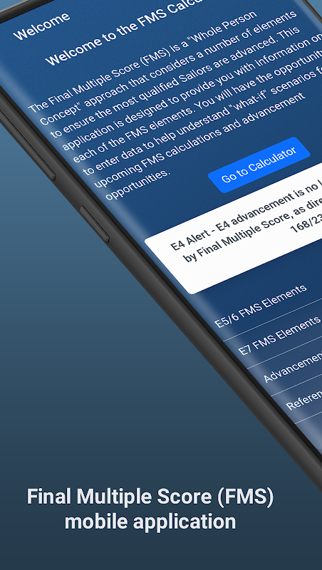 Ta aplikacja mobilna oblicza „co by było, gdyby” końcowe wyniki wielokrotne (FMS) dla marynarzy zaciągniętych od E4 do E6 kwalifikujących się do awansu do zaszeregowania od E5 do E7.