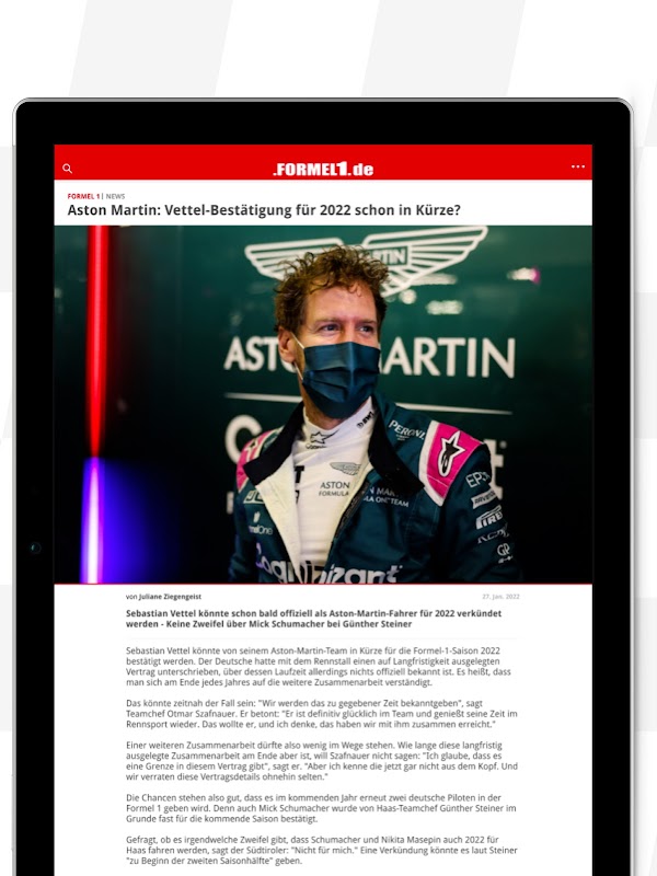 Zacznij już teraz i pobierz Formula1.de na swój smartfon lub tablet! I jak przystało na najwyższą klasę sportów motorowych, nowa aplikacja Formula1.de jest stale rozwijana. Jeśli masz problemy z naszą nową aplikacją lub masz pomysły, jak możemy ją ulepszyć, wyślij e-mail na adres [email protected]. To najszybszy sposób, w jaki możemy zareagować.