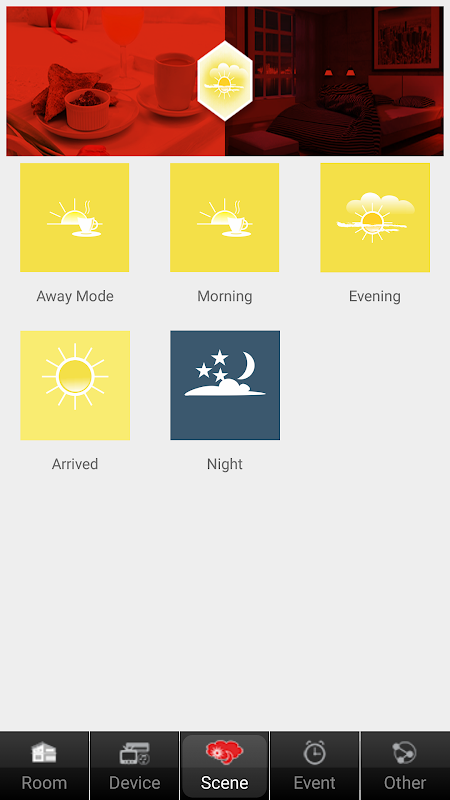 1. Można tworzyć różne sceny lub tryb (jedno kliknięcie ustawia cały dom)