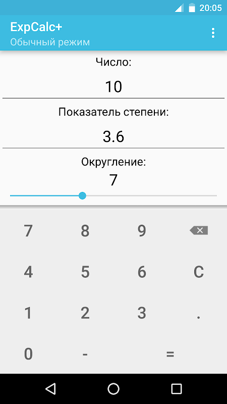 ExpCalc+ - программа, с помощью которой Вы легко и просто сможете вычислить степень какого-либо числа и даже дроби.
